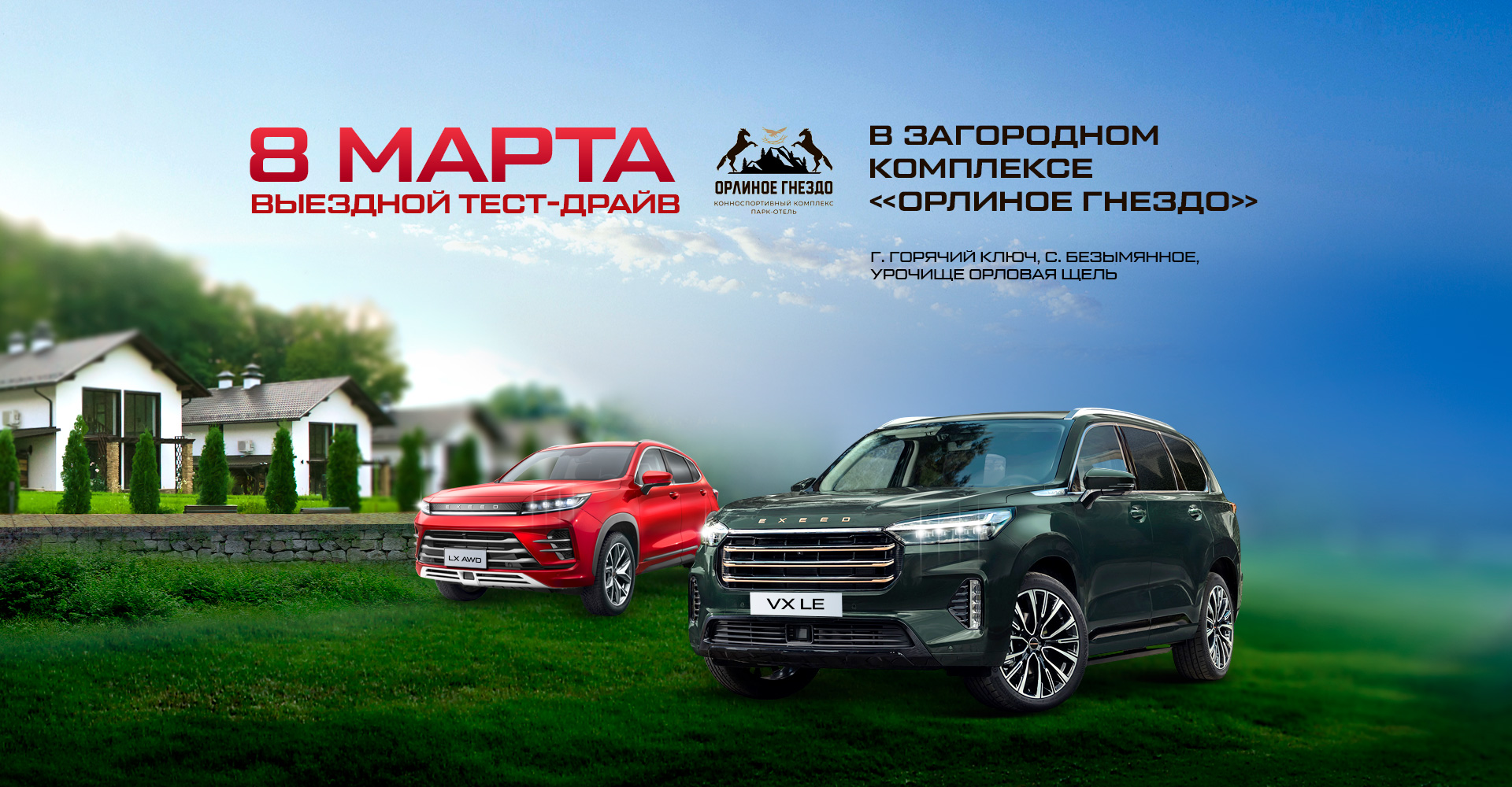 Уже 8 марта на территории конно-спортивного комплекса «Орлиное гнездо» Вы сможете испытать брутальный EXEED VX и технологичный EXEED LX в условиях естественного бездорожья.